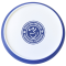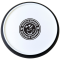 - Circular white plastic coaster with a coloured silicone edge.